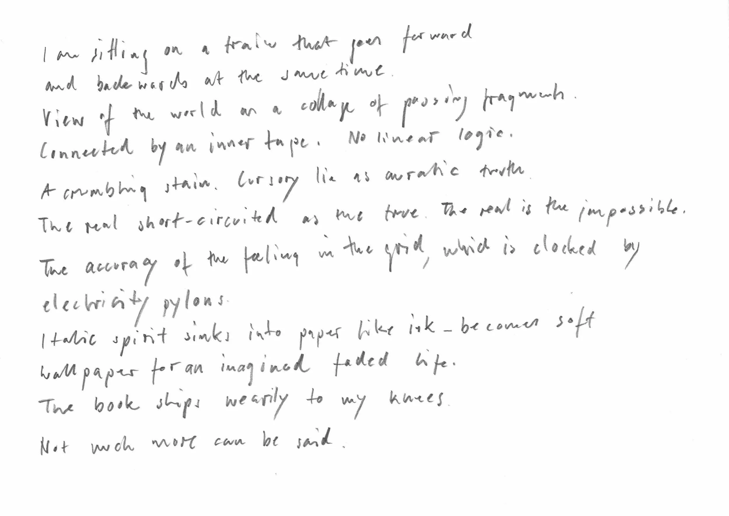 Ein weiteres zentrales Motiv der Ausstellung ist die Schrift – einem Medium, dem sich die vertretenen Künstlerinnen und Künstler statt auf semiotischer vielmehr auf formeller Ebene annähern. Frustriert von den Grenzen der Sprache verlieh der Schriftsteller und Künstler Henri Michaux seiner Innenwelt mit tachistischen Tuschezeichnungen Ausdruck. Seine für das Informel wegweisende Arbeiten treten in Dialog mit Künstlerinnen und Künstlern, die am Rande der Lesbarkeit mit der Affordanz des geschriebenen Wortes spielen. Friederike Feldmanns großformatige geschwungene Linien wollen als Schrift entziffert werden, obwohl sie Buchstaben entbehren; Travis Jeppesen löst in seinen Zeichnungen graduell die Elemente des lateinischen Alphabets auf.