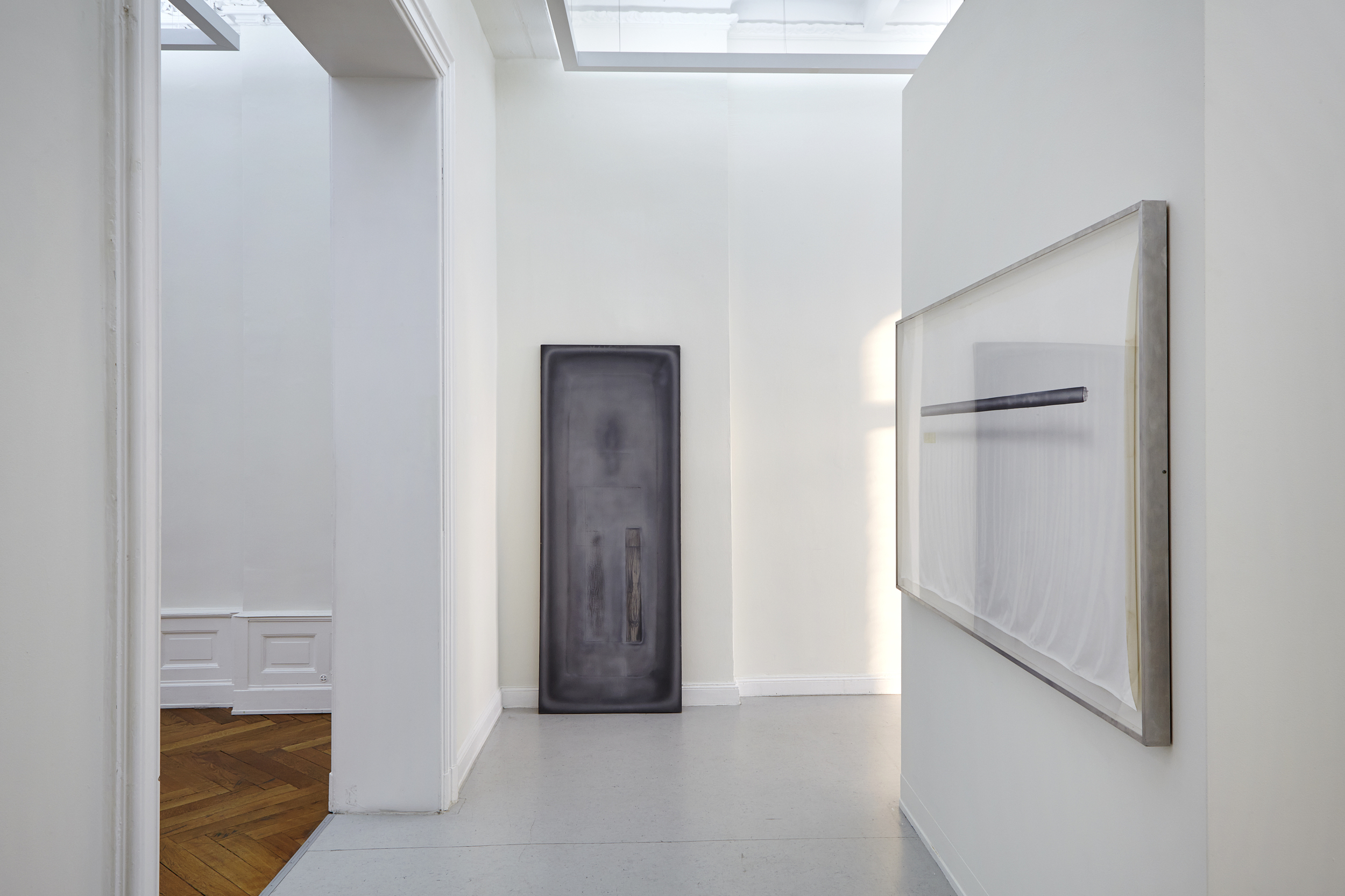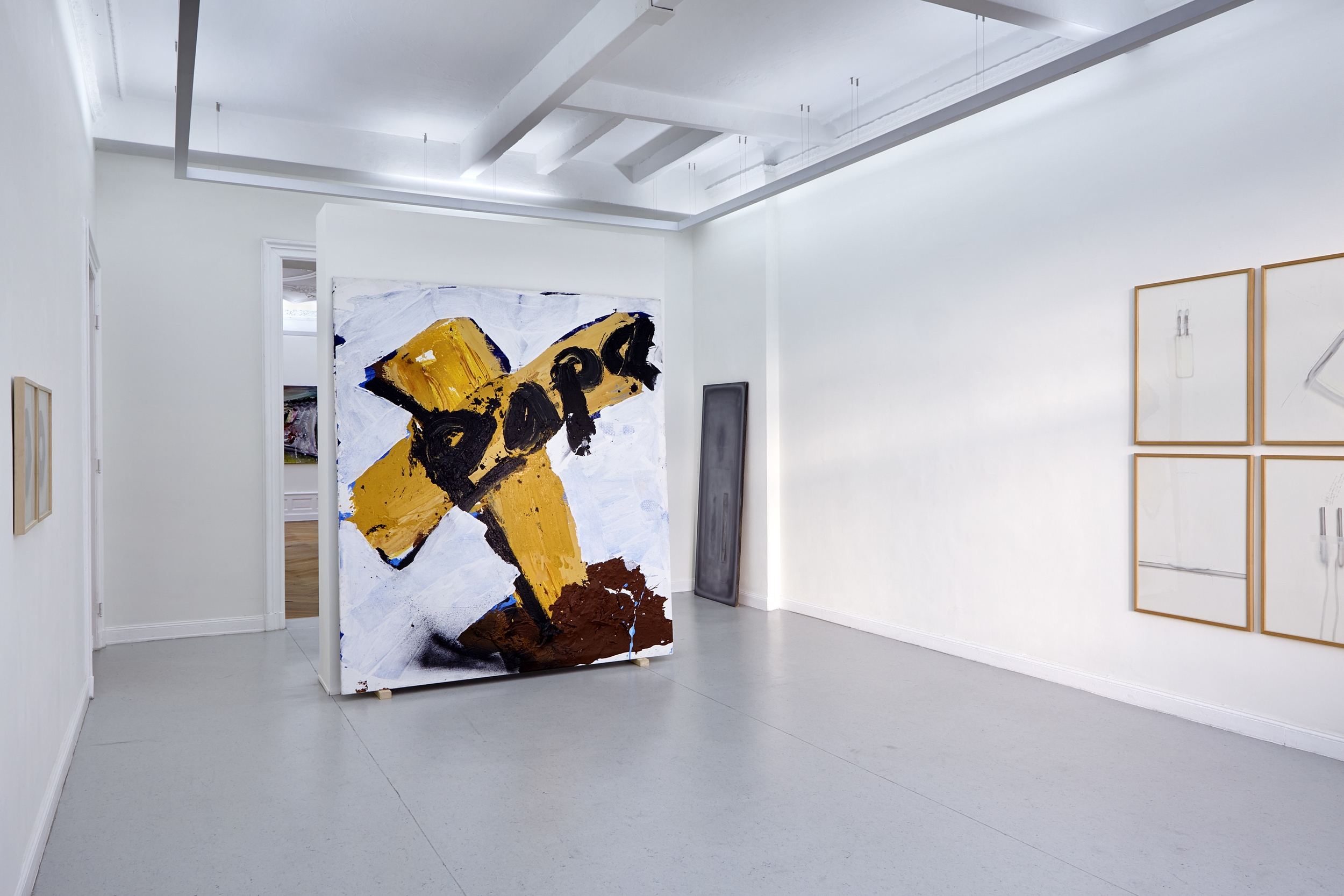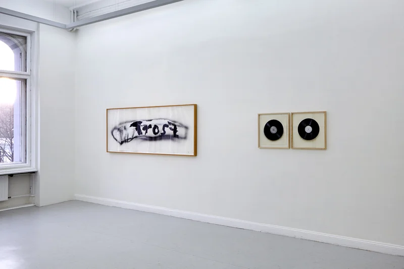 Dieter Krieg read voraciously, focusing on the literature of his century. Vian, Beckett, Gombrowicz, Proust, Musil, Schmidt, Freud, Joyce, Gütersloh, Groddeck, Laederach, Jelinek, Gaddis, Willeford, Sartre, Heidegger and much more. This was no educational goal, he read, as he recalled, for his enjoyment. Through reading, he came closer to his subject matter. Sometimes the encounter with his own already realized artistic material in literature, as struck him so particularly in Laederach, gave him cause to think: Did this come from his paintings, or was it material that emerged independently at different times? To say, however, that he 'used' literature, is clearly mistaken. Literature was a part of his life in the studio: „Keine Landschaft, kein Horizont, keine Reise“ (no landscape, no horizon, no journey) as well as 'In der Leere ist Nichts' (in the emptiness is nothing). This last sentence, to which Krieg devoted two large painting cycles, he also referred to in his laconic style as „Sartre babble.“ Precisely therein, in those deeply earnest words, their grotesquely exagerrated claim, Krieg found the material by which paintings could be created from text and object; a discovery that ignited his mind and his work.