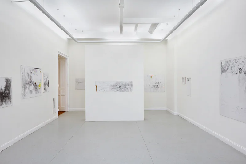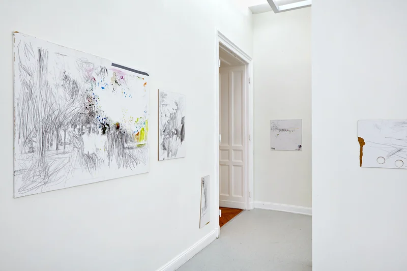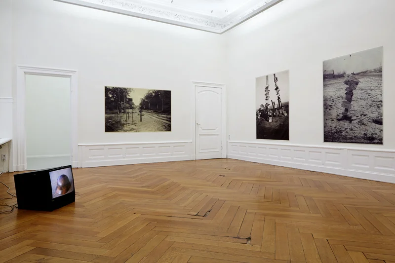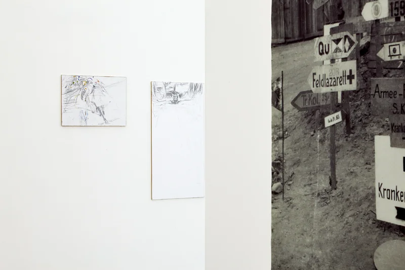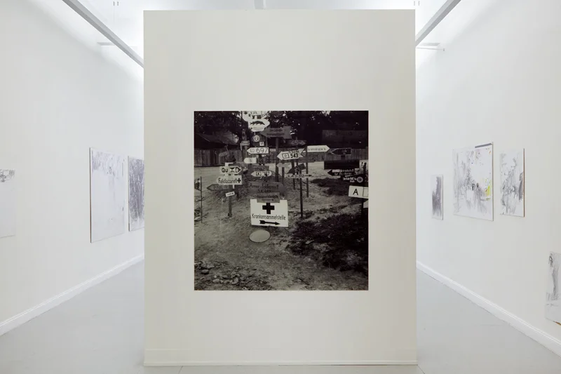 The conceptual point of origin for the exhibition at KUNSTSAELE is a selection from a total of 700 images of so-called “Schilderwälder” (signs forests) from World War II, acquired by Martin Dammann from a militaria-trader for a private photo archive. Presented as large-format banner prints on the walls of the stucco-adorned Salon, they are the distilled version of an extensive collection of the same subject, repeated over and over again. The video work Collecting Militaria gives you something to talk about (2003) is shown on a CRT-monitor: Estranging as much as intimately revealing, it documents the attempts of an American collector of German World War II helmets to explain in what the amassing of such helmets means to him. Meanwhile, the speaker's physiognomy remains strange and anonymous: his elucidating voice is off-screen. The subjects of the drawings on display in the adjoining main room are from Dammmann's own collection of images from private photo albums. Hardboards that had been used as a surface for watercolors now function as sign-like plates. They allow traces of past works to show through, fragmented and vulnerable on the raw screens. Groups of people structure and so determine the composition: as the images' subject matter, they oscillate between dissolution and reification, between collective and individual meaning, on the far side off any identifiable place. Taken out of its original intimate context, the watercolor Sea of Love (2010), also painted after a photographic model, lays no claims on representing reality, while nonetheless creating an impression of a real situation: The picture of a sleeping man, surrounded by images, becomes the embodiment of fragmentary representations. Through its direct orientation towards the viewer, it constructs an extra-pictorial subject which is prompted to partake in the changeable interpretation of the image.