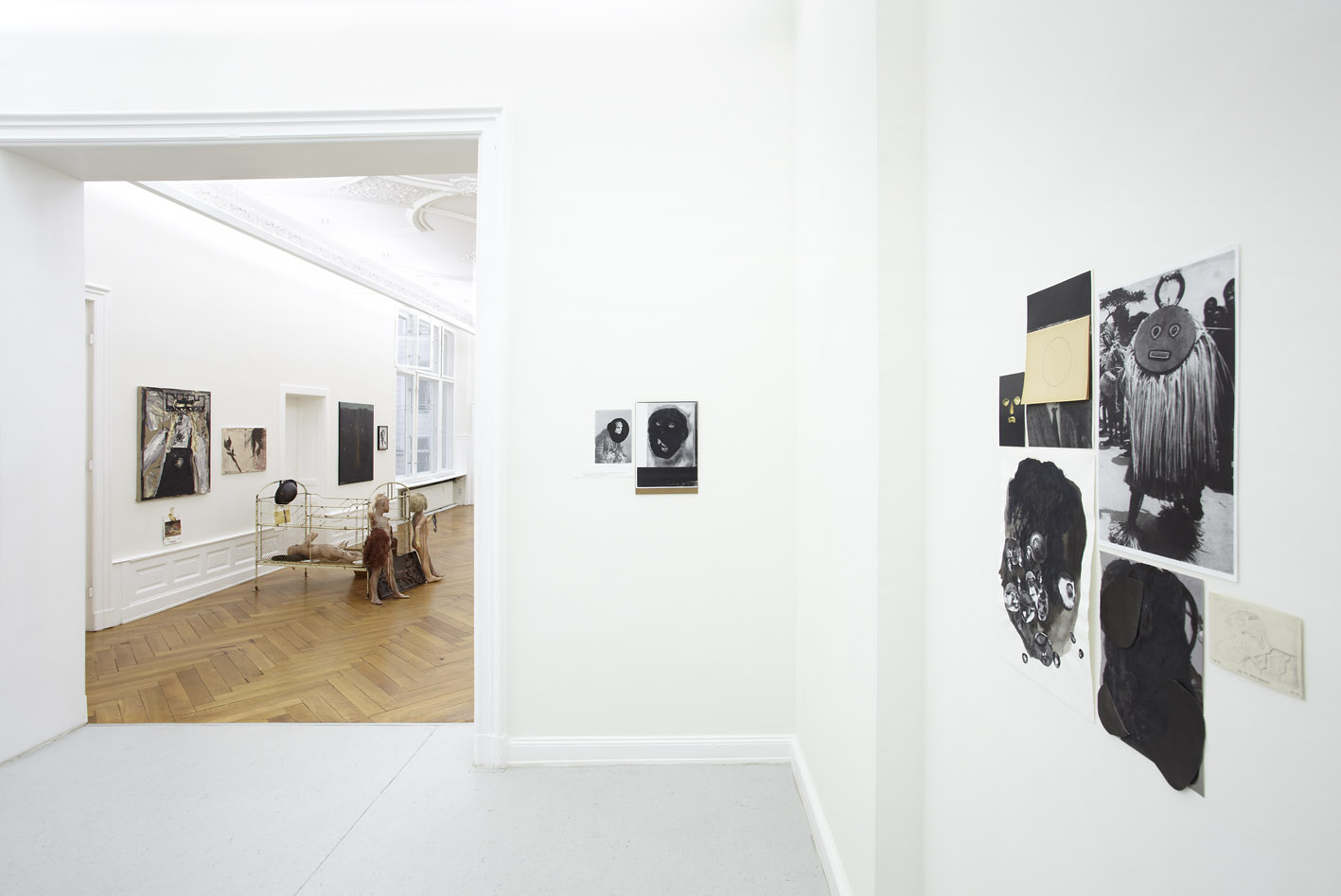 Autobiographische Bezüge finden sich auch in Thomas Schroerens Familienaufstellung von 2009 ('Turm Charlotte Schroeren'; 'Turm Werner Schroeren'; 'Turm Thomas Schroeren CCXXXI m hoch'). Jonathan Meeses Installation 'Les Enfants-Balthys De Saint Just (Phoebe Caulfield)' von 2001 lässt autobiographische Bezüge nur vermuten, - vielschichtige Verweise an den französischen Revolutionär und Moralisten Saint Just bis zum polnischstämmigen Maler Balthus verschmelzen zu einem dichten Raumgefüge. Ein dunkles Kolorit haben auch die Malereien von Andy Hope 1930 ('No Escape from Destiny', 2003) und Thomas Zipp ('A.B.:M.N.C.M. ', 2008, zweiteilig) sowie die Collagen Özlem Altins ('They are not resisting our gaze I and II', 2009). André Butzers 'Dommer Aff' (2001), aber auch Thomas Schroerens Arbeiten 'Take me out of myself and set me free' (2007) und 'General Shima' (2006) wirken dabei wie Beobachter der grotesken Szenerie. Ihr der Welt trotzendes Lächeln wirkt zum Teil in sich gekehrt, zum Teil wie ein mitfühlender Ausdruck von Außenseitern zur 'condicio humana', einer Gesellschaft, die ihren Mittelpunkt - ihr Zentrum - längst verloren hat.