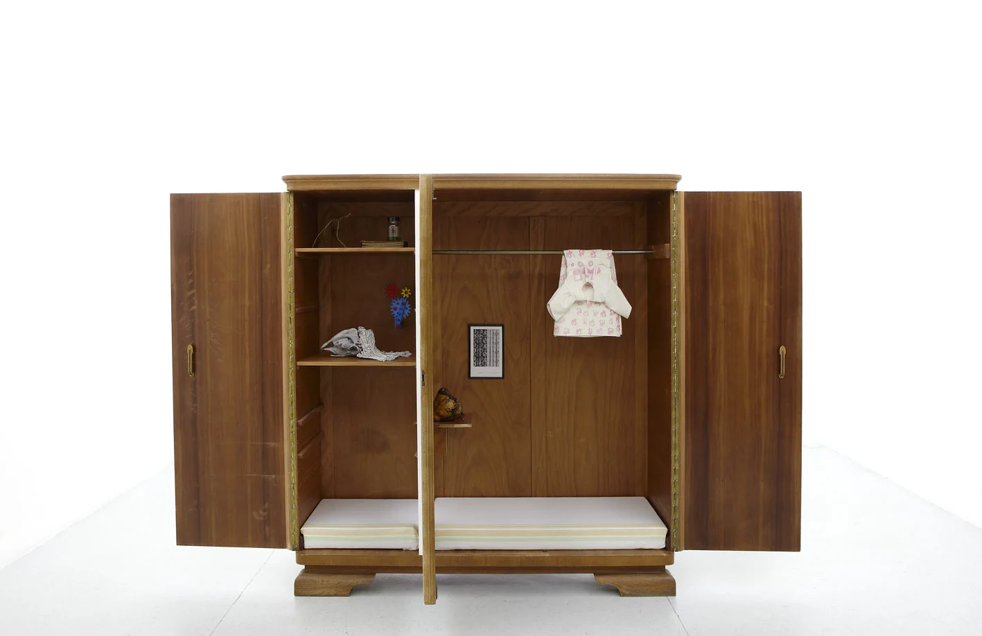 Obgleich sich die ausgestellten Werke durchweg einer eindeutigen Interpretation und Festlegung entziehen, sind vielfach gesellschaftliche, politische bzw. historische Themen Ausgangspunkt und Inspiration, wobei weniger eine 'politisch korrekte' Aufarbeitung, als eine subjektivistische Sichtweise vorherrscht. Ein Beispiel hierfür ist die Installation 'Sachsenwald' (2010) der Künstlerin Franka Kaßner, die sich in ihren komplexen, autobiographisch inspirierten Arbeiten mit Totalitarismus, Überwachung und Unterdrückung auseinandersetzt und deren historischen Wurzeln in der deutschen Romantik recherchiert. 'Sachsenwald' ist einerseits von einer subtilen Schönheit und Wehmut gekennzeichnet - auf der Rückseite eines Kleiderschrankes aus 'Deutscher Eiche' erkennt man in altmeisterlicher Schellack Technik eine Inkunabel der Romantik, Caspar David Friedrich's Kreidefelsen; andererseits vermittelt das mit DDR-Relikten autobiographisch aufgeladene Innenleben des Schrankes eine beklemmende Stimmung.